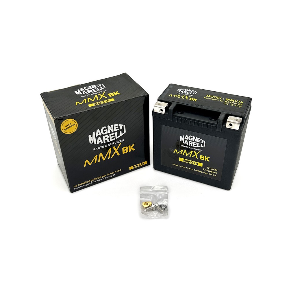 Batteria Marelli MMX14PRECARICATA SigillataSenza manutenzione, Alto Spunto, (MF Maintenance Free); 12 V 12 Ah 151X85X146 mm; Acido 0,68 l; Corrente carica 1,40 A; CCA 275Batterie Marelli serie MMX, col 30% di potenza in più, senza manutenzione, ricarica più veloce e materiale rinforzato.Applicazioni: BMW R 1200GS 06-07; Honda Africa Twin 750 93-03; Kawasaki ZX-12R Ninja 1200 00-03; Suzuki Burgman 650 02-05; DL V-Strom 1000 01-05Riferimento originale: AP.AP8124284/638733Altri riferimenti: YTX14-BSLe descrizioni dei prodotti sono generate automaticamente dal nostro Flavio AI . Se notate eventuali imprecisioni o desiderate maggiori dettagli, non esitate a contattarci via Email.