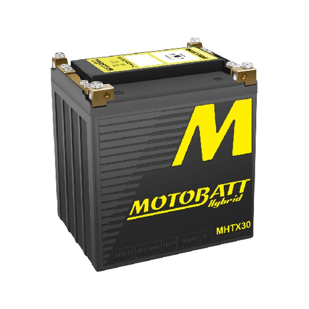 Batteria Motobatt MHTX30HYBRIDIbrida Litio e Piombo (attivata in fabbrica - Factory Activated); 12 V 24 Ah 166x126x175 mm; Acido - l; Corrente carica - A; CCA 650 Le Motobatt Hybrid uniscono la tecnologia tradizionale al piombo con la più recente al Litio. In questo modo si ottiene un\'elevata capacità di carica, una maggior resistenza alle sovratensioni ed uno spunto molto elevato. E\' indicata anche per veicoli con impianti di ricarica datati o su mezzi dove la tensione nominale di ricarica è maggiore rispetto a livelli standard (comunque entro i parametri del costruttore).Le batterie Motobatt Hybrid sfruttano il meglio della tecnoligia al Litio (LiFePO4) e della standard al Piombo. Grazie aquesto riescono ad avere rispetto la medesima batteria al piombio:90% di spunto in piu\';30% di peso in meno;50% di autoscarica in meno;CCA costante alle basse temperature;Maggior Vita. Rispetto alle batterie al Litio:Completa Compatibilità con il sistema di ricarica della moto;oltre il 200% di Capacita\' (Ah) in piu\';Maggior Stabilita\' alle alte temperature;CCA costante alle basse temperature;Compatibilie con i caricabatterie non specifici Litio;Maggior Vita. In piu\'ha 6 terminali per ogni polo, quindi ogni utilizzatore ha il suo dedicato. Nella confezione e\' compreso 1 spacer da 17mm.Applicazioni: BMW K1100 LT 92-97; Ducati Sport 900 Darmah 75-85; Harley Davidson FLHT Electra Glide 1450 00-06; Piaggio Ape 50Altri riferimenti: YB30L-BLe descrizioni dei prodotti sono generate automaticamente dal nostro Flavio AI . Se notate eventuali imprecisioni o desiderate maggiori dettagli, non esitate a contattarci via Email.