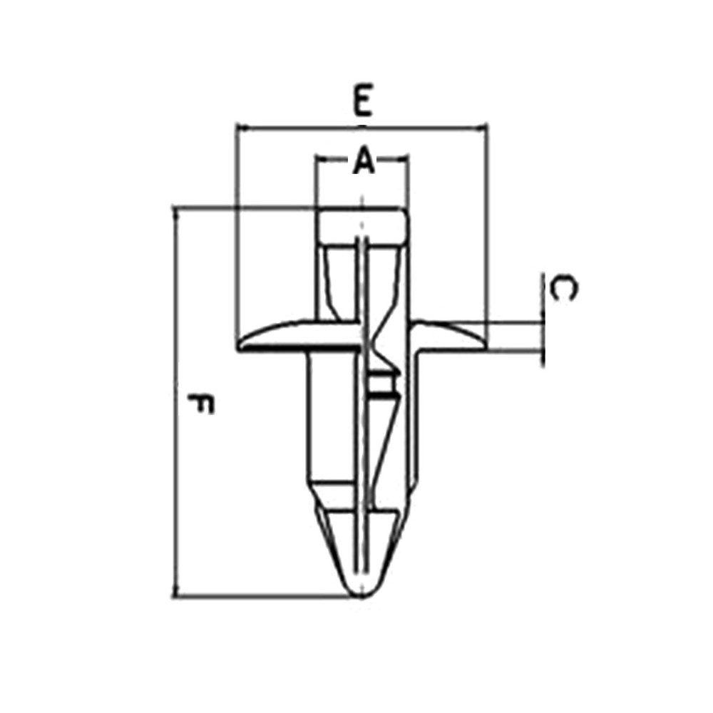 Rivetti A Spinta X Carena 10PZFORO 6 Mm GrigioRivetti a tirare in plastica per fori da 6,0 mm Dimensioni: Spessore: 4,0 - 6,0 mm A: 4,7 mm C: 2,0 mm E: 20,0 mm F: 15,0 mm