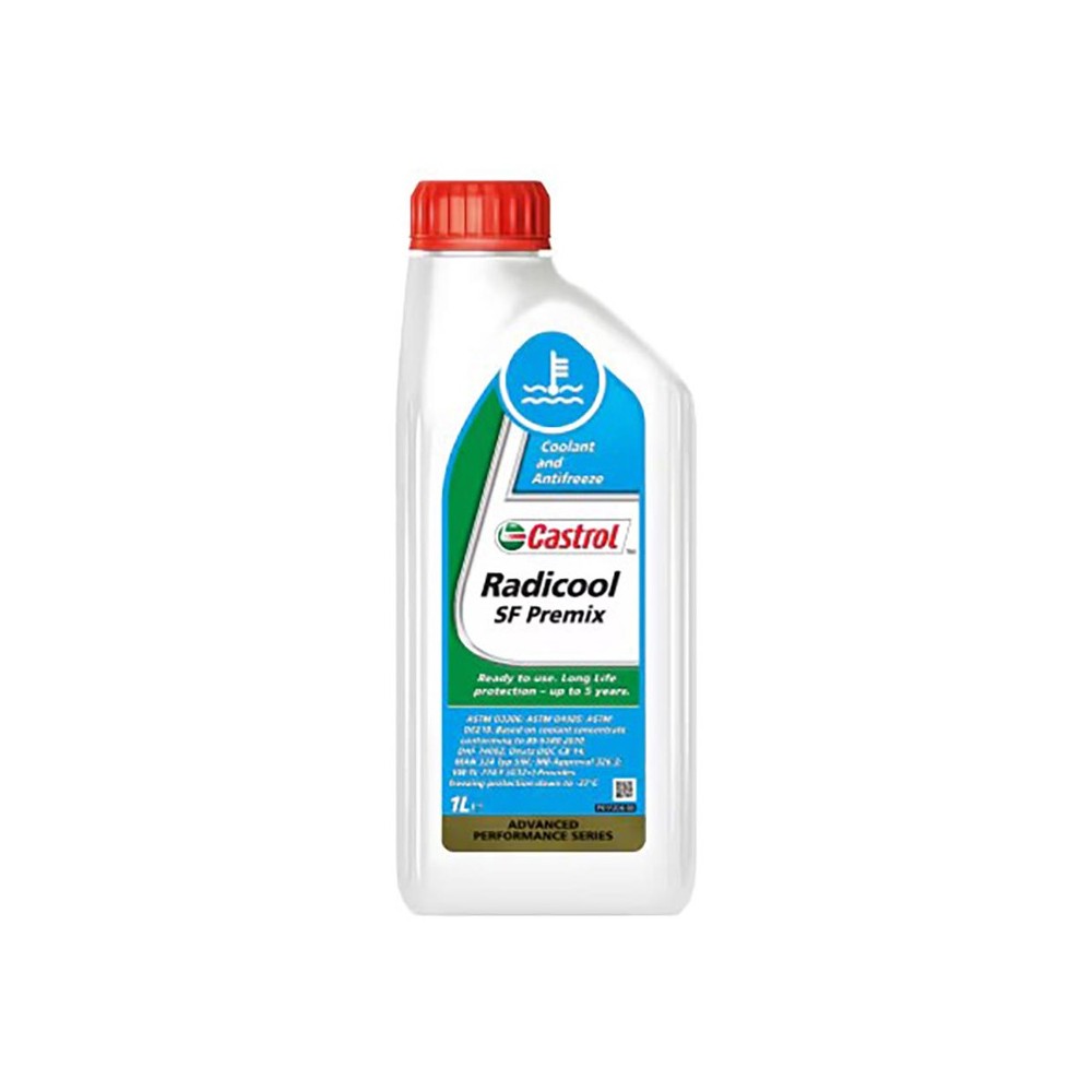 Radicool Premix 1LAllunga l\'intervallo di cambio garantendo un\' ottima protezione contro la corrosione, ostruzione dell\'impianto, surriscaldamento e congelamento. L\'intervallo di cambio maggiore riduce i costi e l\'inquinamento ambientale. Assicura un\'eccelente protezione contro le corrosioni da cavitazioni, riducendo usura e rumore. Previene la formazione dei depositi di calcio, evitando l\'ostruzione anche parziale del radiatore diminuendo il normale flusso dell\'antigelo. Colore azzurro/verde.SPECIFICHE: ASTM D3306(III) ASTM D4985 BS6580:2010 MAN 324 TYP SNF MB Approval 326.3Per i veicoli di ultima generazione che richiedono la tecnologia OAT. Radicool SF Premix e\'un antigelo long-life a base di glicole monoetilenico pronto all\'uso formulato con acidiorganici inibitori secondo la piu\'avanzata tecnologia. A differenza dei tradizionali antigelo, Castrol Radicool SF Premix non contiene ammine, nitriti, fosfati, silicati e altri inibitori inorganici. Garantisce un\'eccellente protezione alla corrosione particolarmente nei motori che impiegano leghe leggere. E\' utilizzabile nella maggior parte dei motori di ultima generazione.Lavora in un ampia scala di temperature per un\'efficiente raffreddamento del motore in tutti i climi, offrendo una protezione dal congelamento fino a -37 gradi. Colore azzurro/verde.Altri riferimenti: 1602C3
